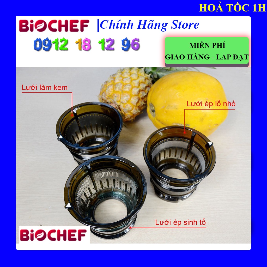 - Với 3 lưới ép: lưới ép lỗ nhỏ, lưới ép sinh tố, lưới làm kem, bạn có thể tùy chọn với từng loại trái cây khác nhau. Nếu bạn muốn thưởng thức ly nước ép nguyên chất hoàn toàn không còn bã thì BioChef đã được trang bị thêm 1 lưới lọc nước ép, giữ lại toàn bộ chất xơ không cần thiết. Bã ép kiệt, bạn có thể tận dụng làm súp hoặc nấu cháo cho bé cũng rất tiện dụng.