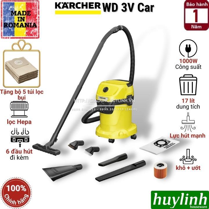 - Máy hút bụi khô và ướt Karcher WD 3 V Car siêu mạnh mẽ, tiết kiệm năng lượng và nhỏ gọn - chỉ với công suất tiêu thụ điện năng 1000 W. Máy gây ấn tượng với đầu hút xe hơi, đầu hút khe hở cực dài và bàn chải hút với lông mềm và cứng.