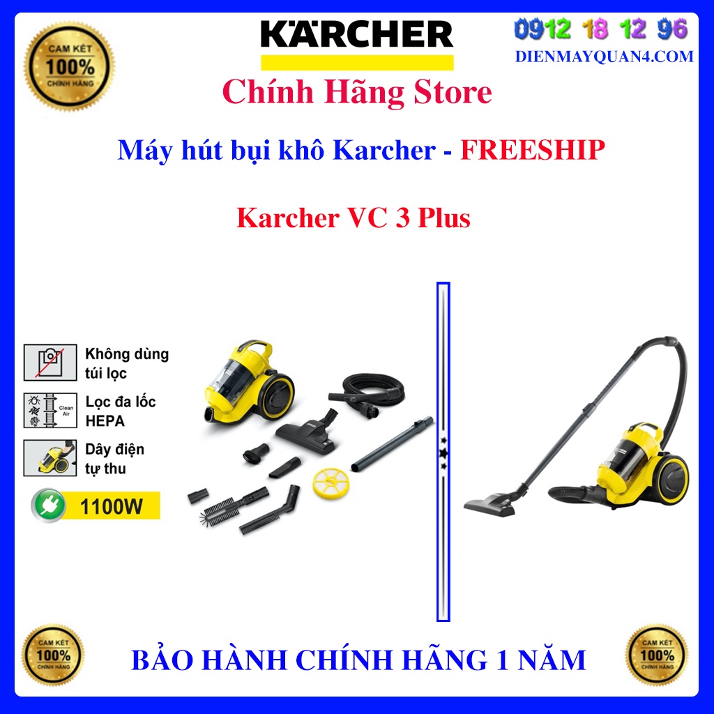- Máy hút bụi Karcher VC 3 Plus có kiểu dáng gọn nhẹ và nổi bật với tone màu vàng đen quen thuộc của hãng, là một thiết bị đáp ứng hoàn hảo cho các nhu cầu hút bụi các hộ gia đình hiện đại. Bên cạnh đó công nghệ multi-cyclone cung cấp lực hút mạnh và khả năng bảo toàn lực hút tối đa.