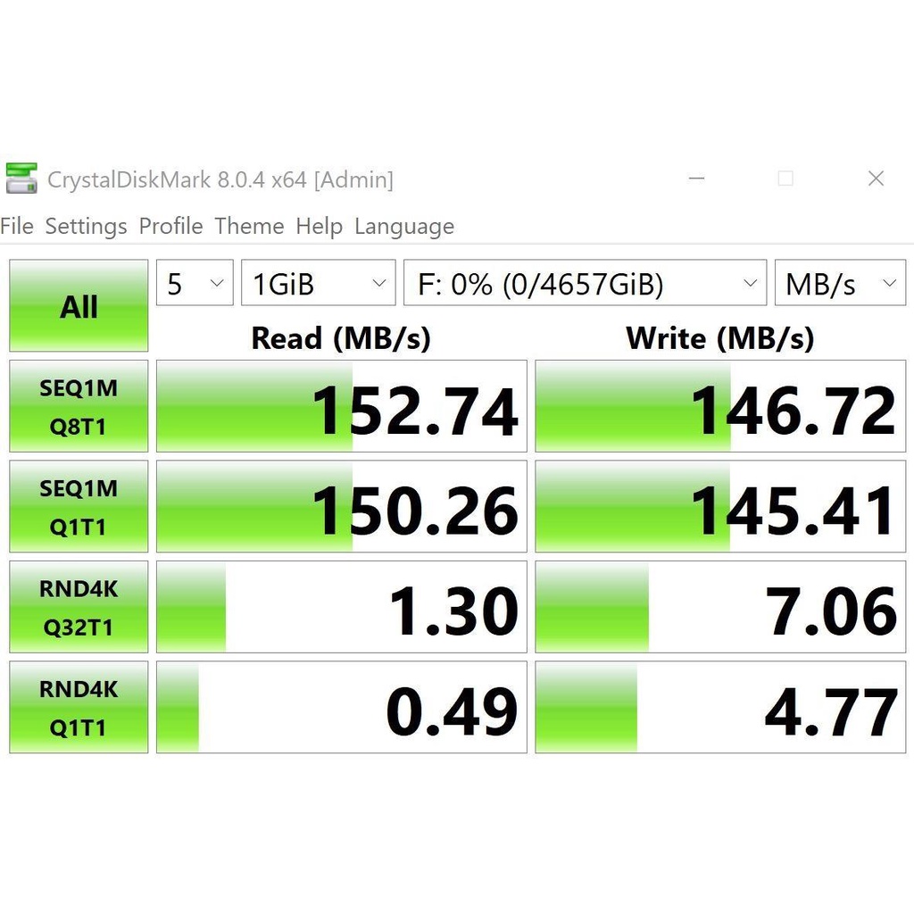 Để kiểm tra hiệu năng, chúng ta dùng phần mềm CrystalDiskMark thì cho ra kết quả khá ấn tượng với: tốc độ đọc/ghi tuần tự là 152 MB/s và 146 MB/s, tốc độ truyền tải cao hơn một chút so với các ổ cứng di động cùng loại.