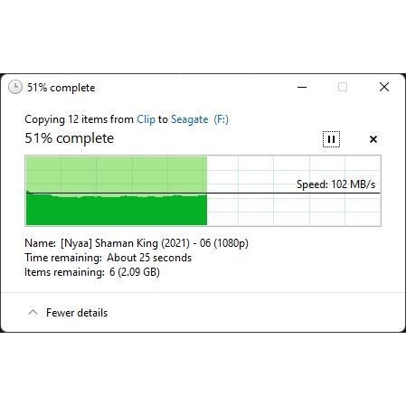 Để kiểm tra tốc độ truyền tải thực tế, chúng ta copy một thư mục với tổng dung lượng 4.29GB từ máy tính sang ổ cứng FireCuda Gaming Hard Drive RGB. Kết quả thu được cho thấy hiệu suất hoạt động tốt, tốc độ trung bình luôn ổn định ở mức 102 MB/s.