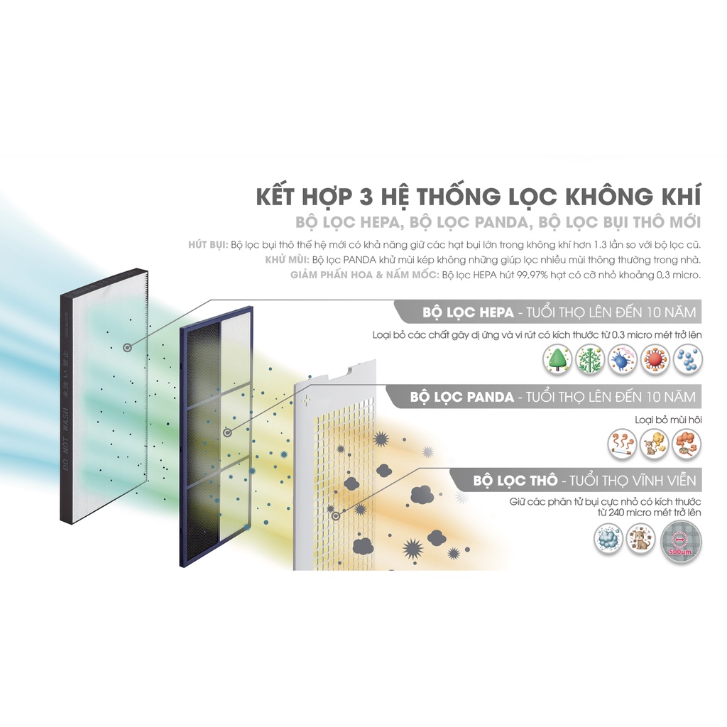 🍀 Trang bị hệ thống 03 màng lọc cao cấp: màng lọc HEPA (10 năm), màng lọc khử mùi kép (10 năm), màng lọc bụi thô (vĩnh viễn) và màng lọc tạo ẩm (10 năm)