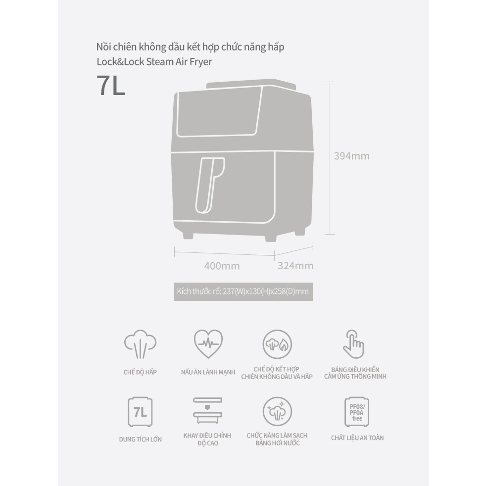 Nồi chiên không dầu kết hợp chức năng hấp Lock&Lock Steam Air Fryer 7L EJF881 (2 màu)Chất liệu: Nhựa PP, nhựa ABS, nhựa PA66, thép