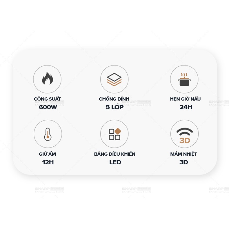 Chức năng nấu: 6 chức năng: gạo trắng, sữa chua, cháo đặc, cháo, súp, giữ ấm.