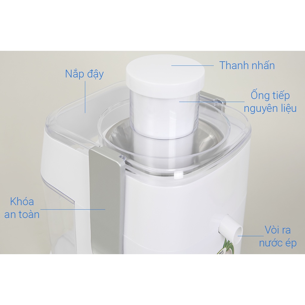 Cốc chứa bằng nhựa AS, những bộ phận khác bằng nhựa PP độ bền cao, an toàn cho sức khỏe, dễ dàng lau chùi. Dung tích 2 cốc chứa đựng được nhiều bã và nước ép, tiết kiệm thời gian ép.