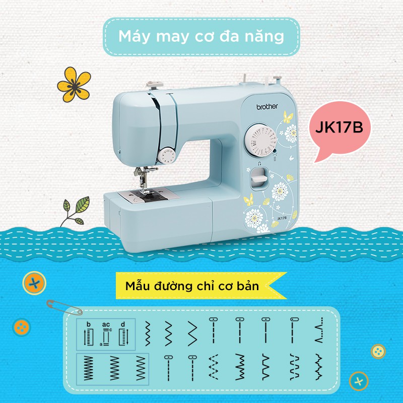 Máy May Gia Đình Brother JK17B có sẵn 17 mũi đường may cơ bản, may được loại chỉ thẳng đơn giản, mũi ziczac và nhiều mũi trang trí khác. Chức năng may kim đôi giúp và độ dài rộng của mũi chỉ có thể điều chỉnh được giúp bạn vừa linh hoạt trong việc may vá vừa có thể tạo ra những đường chỉ đa dạng dày mỏng khác nhau. Ngoài may quần áo máy còn có thể linh hoạt trong việc sữa ch.ữa quần áo, may trang trí nhiều loại chăn, gối, màng, rèm cửa... Tông màu xanh dịu cùng với họa tiết hoa bướm sẽ làm nổi bật thêm cho không gian nhà bạn.
