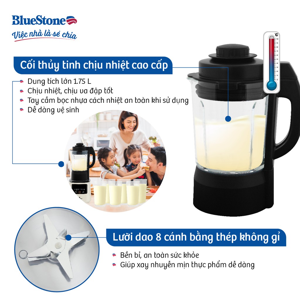 Đặc biệt, máy xay nấu đa năng BlueStone new model BLB-6035 được trang bị cối xay lớn dung tích 1.75L bằng thủy tinh chịu nhiệt cao cấp, kháng vỡ. Tay cầm bọc nhựa cách nhiệt, an toàn và thuận tiện trong khi sử dụng. Máy xay sinh tố BlueStone BLB-6035 là một sản phẩm đa chức năng với 6 chế độ cài đặt sẵn vô cùng tiện lợi như: Sữa hạt, cháo dinh dưỡng, sữa bắp, súp, sinh tố, sữa lắc, thao tác dễ dàng với bảng điều khiển cảm ứng tiếng Việt.