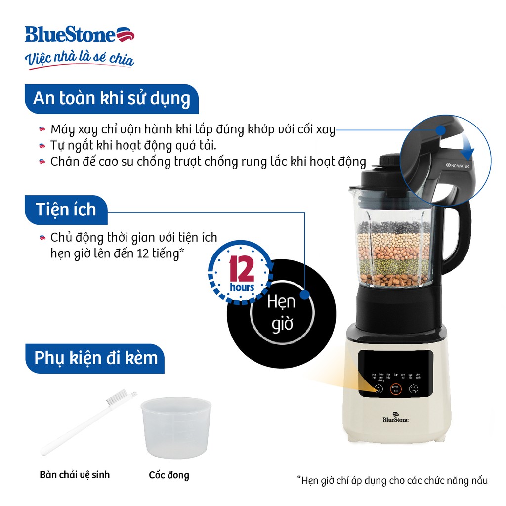 Ngoài ra, máy xay nấu đa năng BlueStone BLB-6035 có chân đế chống trượt vững chắc giúp máy đứng thăng bằng khi hoạt động không bị nghiêng. Đảm bảo an toàn tuyệt đổi trong khi sử dụng với tính năng tự ngắt khi quá nhiệt và chỉ vận hành khi lắp đúng khớp. Dễ dàng vệ sinh với chế độ tự làm sạch sau khi sử dụng và chủ động thời gian với tiện ích hẹn giờ lên đến 12 tiếng. Tiện lợi hơn với bộ phụ kiện đi kèm gồm cốc đong và bản chải vệ sinh.