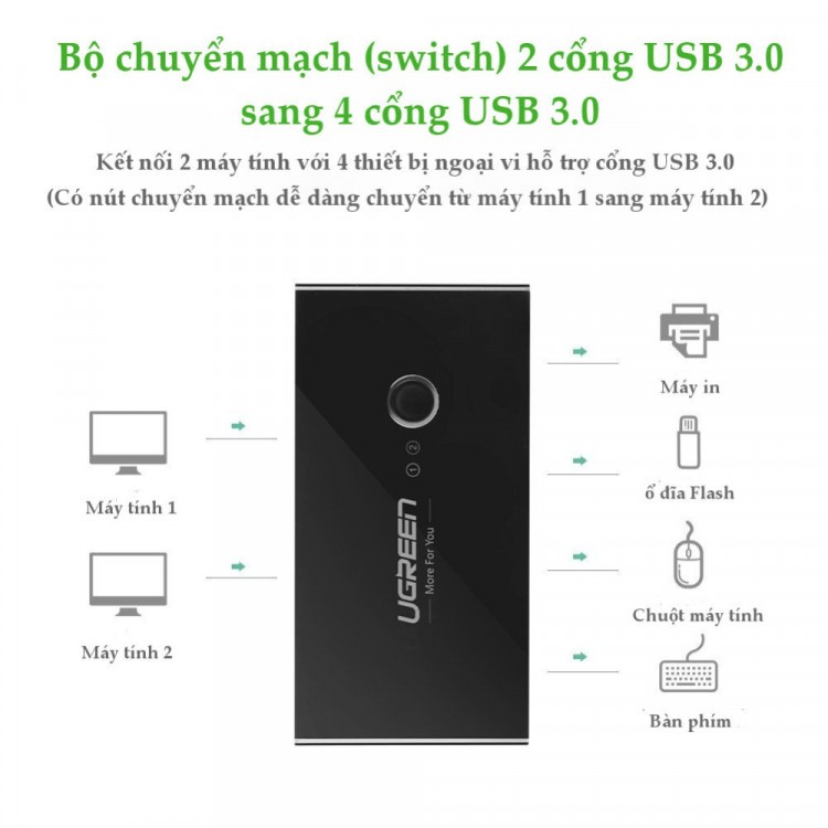 • Bộ Chuyển Mạch USB 3.0 4 Cổng Ugreen 30768 là sự lựa chọn tuyệt vời để chia sẻ 4 thiết bị USB giữa hai máy tính cá nhân. Một giải pháp lý tưởng để chia sẻ một máy in hoặc máy quét trong môi trường văn phòng hoặc tại nhà của bạn.