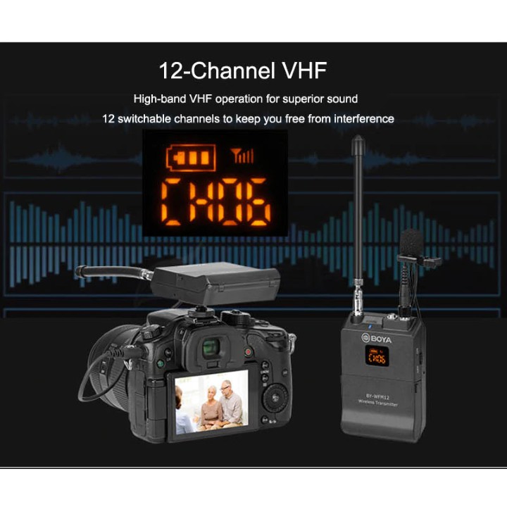 - BỘ MICRO KHÔNG DÂY BOYA BY-WFM12 ĐƯỢC TRANG BỊ SÓNG VHF DẢI TẦN RIÊNG VỚI 12 KÊNH SÓNG, CHO KHẢ NĂNG ỔN ĐỊNH TÍN HIỆU CAO, KHÔNG BỊ LẪN SÓNG HOẶC SUY HAO TÍN HIỆU.