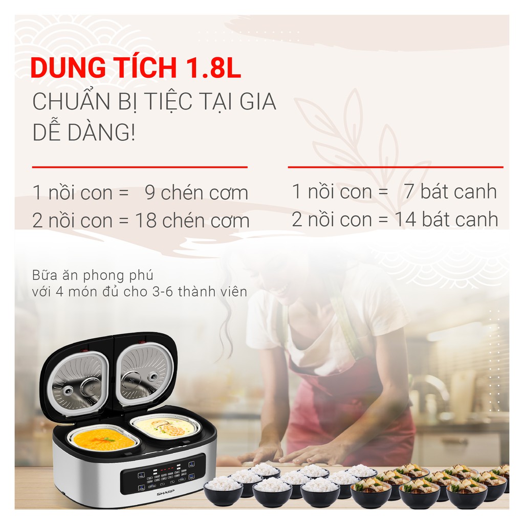 • Dung tích 1.8 lít (0.9 lít x 2) nấu cơm phù hợp cho 4 - 6 người.