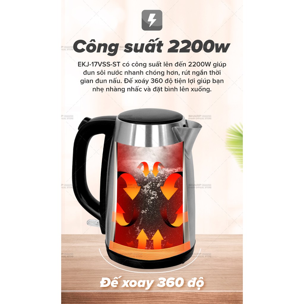 • Bình đun siêu tốc Sharp EKJ-17VSS-ST có công suất lên đến 2200W giúp đun sôi nước nhanh chóng hơn, rút ngắn thời gian đun nấu. Đế xoáy 360 độ tiện lợi giúp bạn nhẹ nhàng nhấc và đặt bình lên xuống.