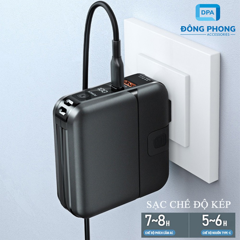 - Dù thiết kế nhỏ gọn, nhưng cục pin sạc dự phòng đa năng này lại tích hợp rất nhiều cổng sạc, dây sạc và chân cắm AC xung quanh: