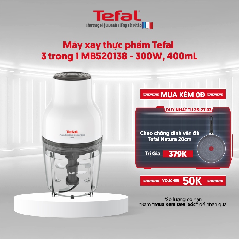 Thiết Bị Điện Gia Dụng > Đồ gia dụng nhà bếp > Máy chế biến thực phẩm & Xay thịt || [Mã ELTF03 giảm 10% đơn 500K] Máy xay thực phẩm Tefal 3 trong 1 MB520138 - 300W, 400mLCòn hàng