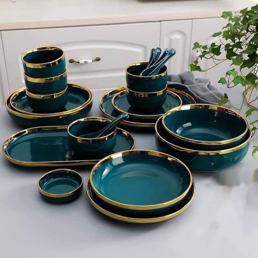 - Màu sắc: Bộ bát có màu xanh cổ vịt và màu trắng viền vàng sang trọng