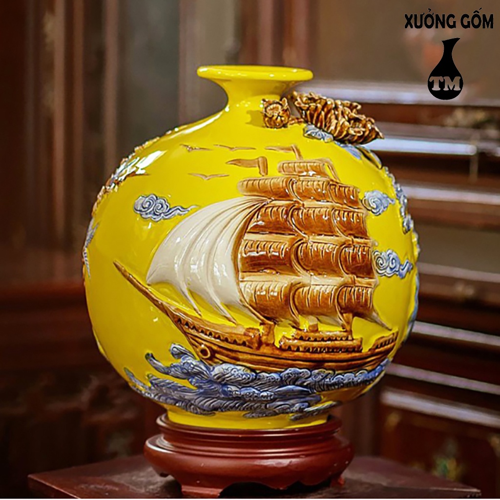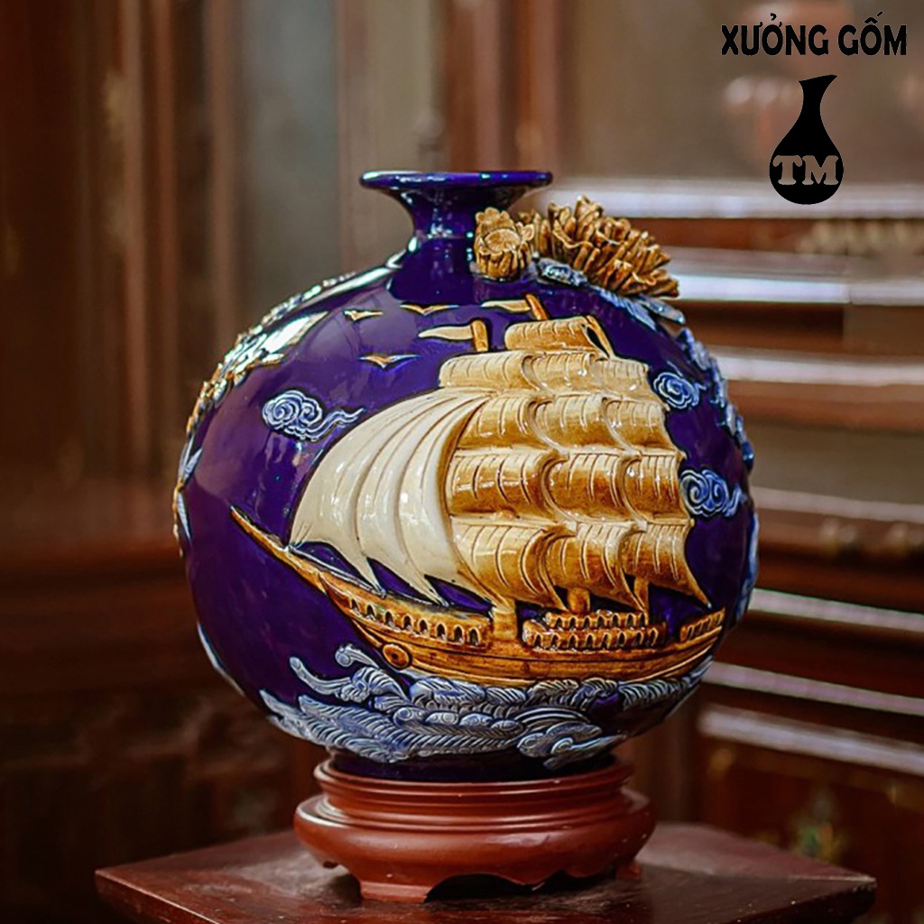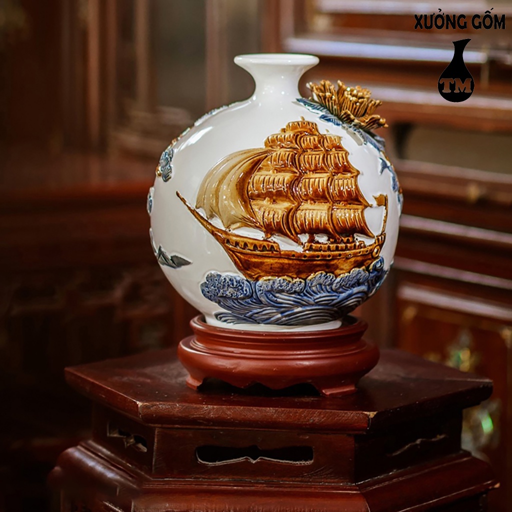 Bình Hút Tài Lộc Đắp Nổi Thuận Buồm Xuôi Gió Xưởng Gốm TM Bát Tràng + Tặng 01 Đế Kê