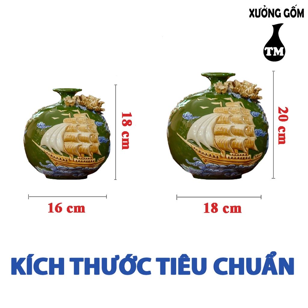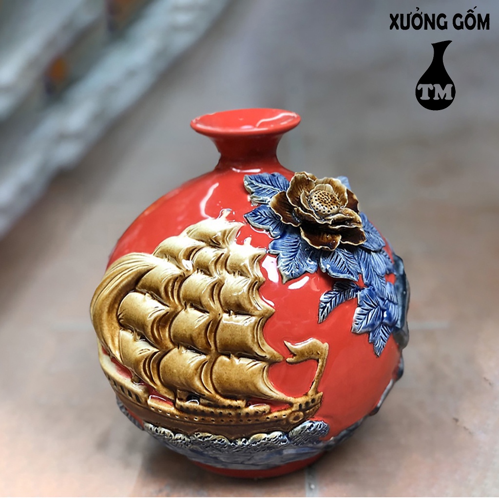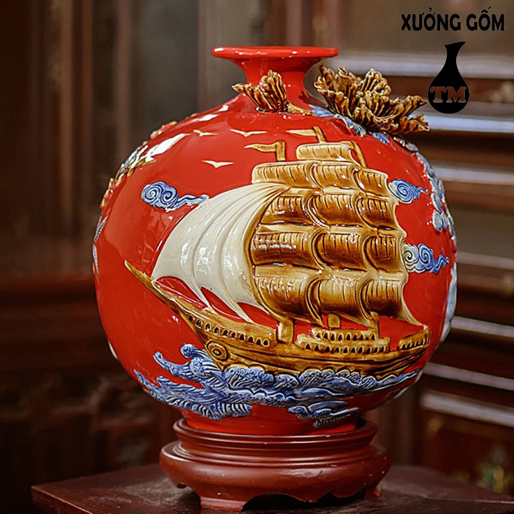 Bình Hút Tài Lộc Đắp Nổi Thuận Buồm Xuôi Gió Xưởng Gốm TM Bát Tràng + Tặng 01 Đế Kê
