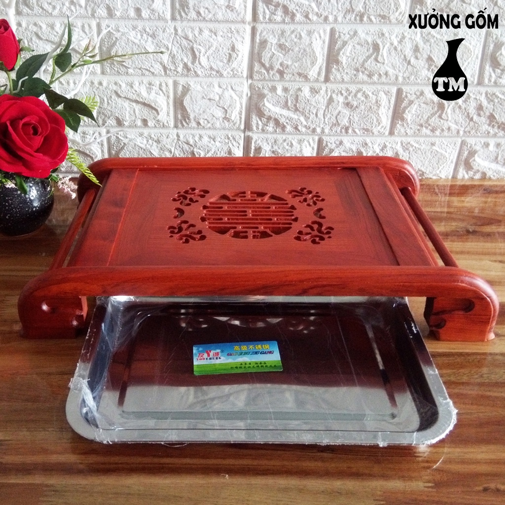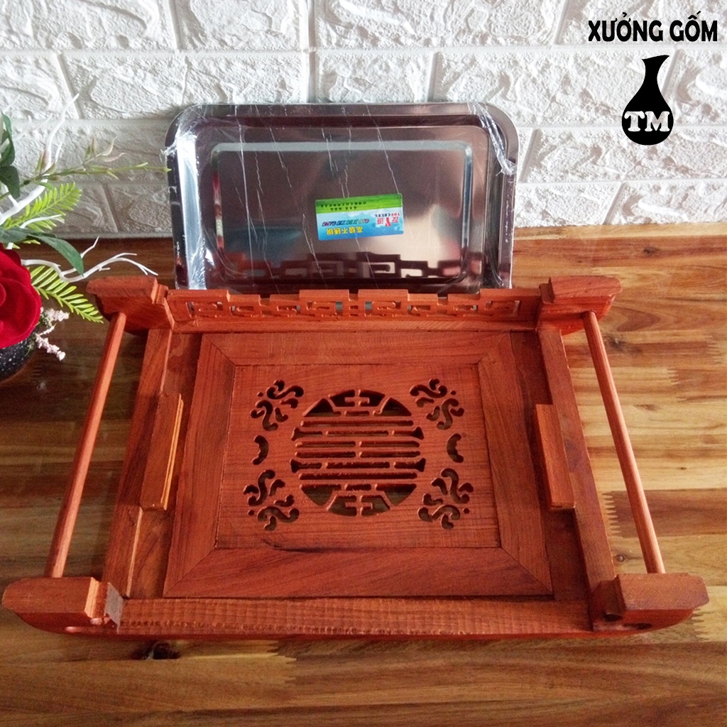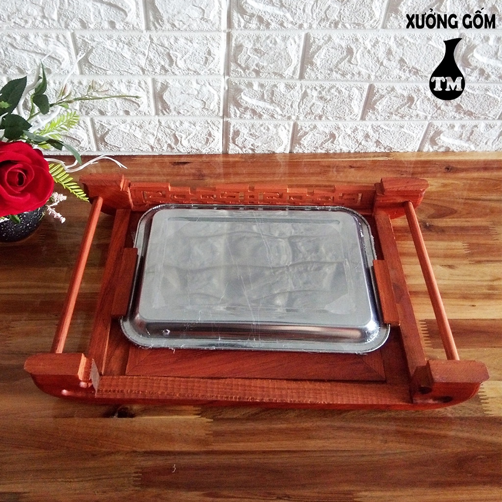 Nhà cửa & Đời sống > Bộ đồ bàn ăn > Khay, tấm lót bàn ăn || [Mã INCU50 giảm 50K đơn 250K] Khay trà cuốn gỗ hương ta màu đỏ kèm khay inox hứng nước sang trọng Xưởng Gốm TM Bát TràngCòn hàng