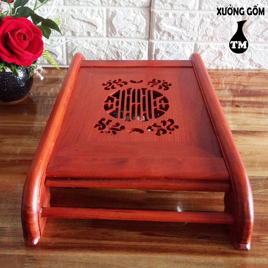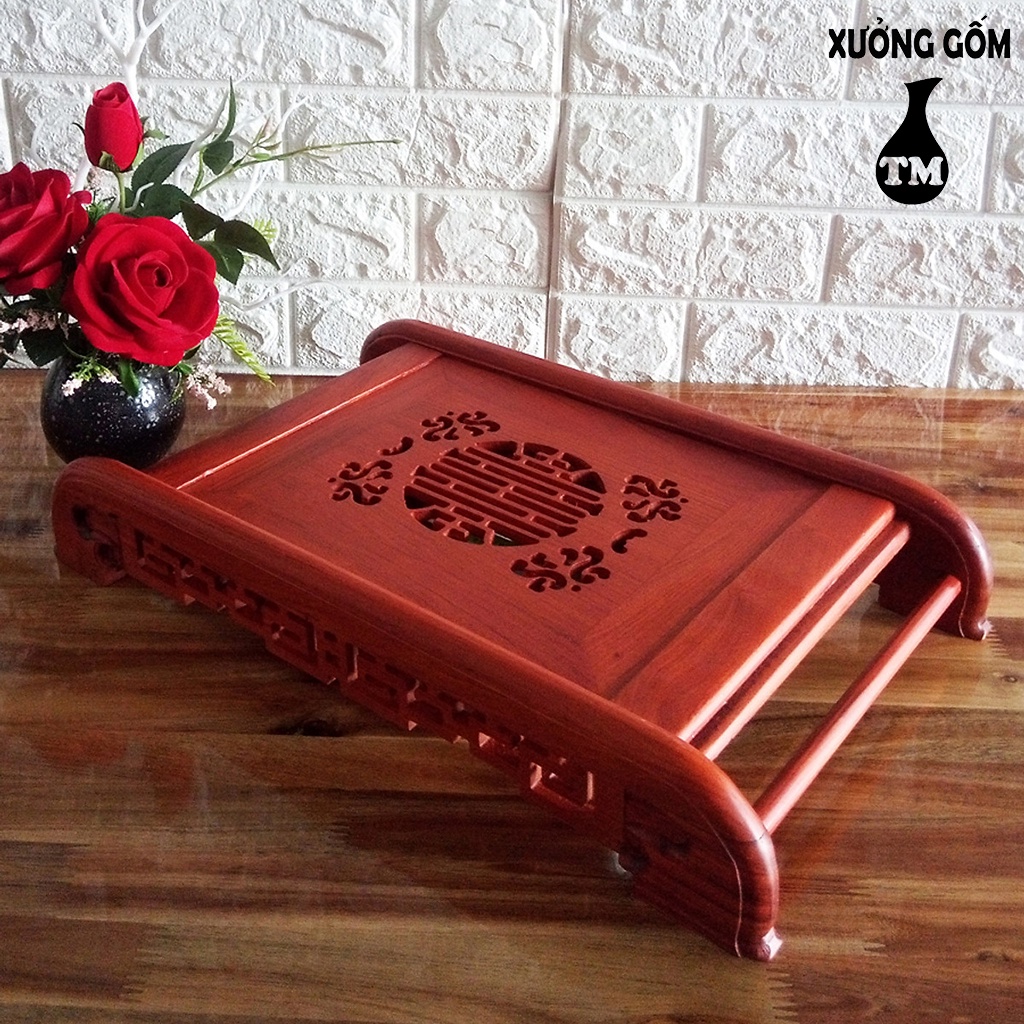 Khay trà cuốn gỗ hương ta màu đỏ kèm khay inox hứng nước sang trọng Xưởng Gốm TM Bát Tràng
