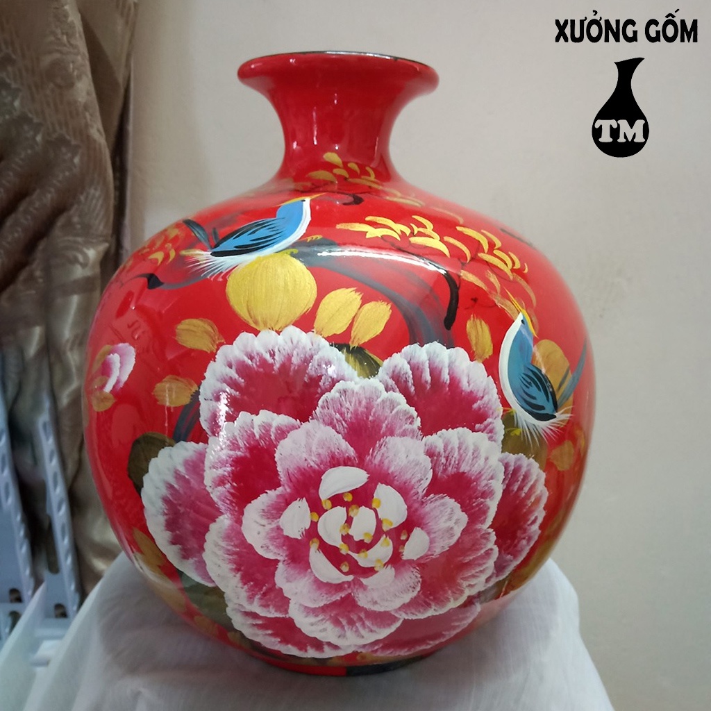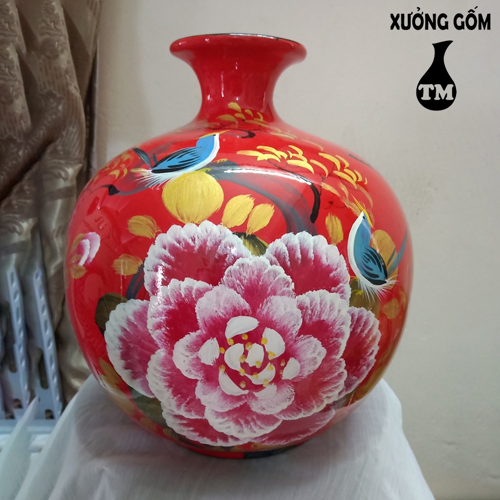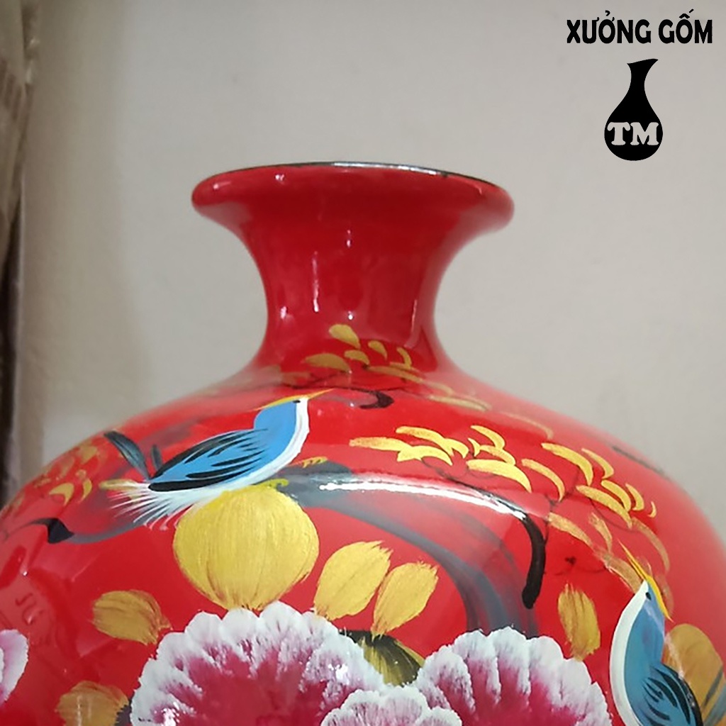 Bình hút tài lộc sơn mài Xưởng Gốm TM Bát Tràng họa tiết vẽ tay H25 + Tặng kèm đế kê
