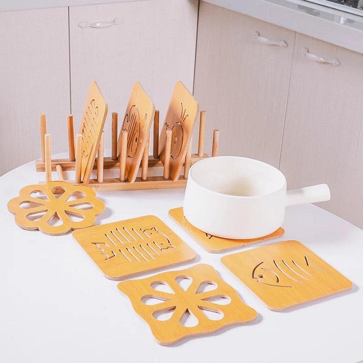 1. Sản phẩm dùng để lót xoong, nồi, chảo, bát đĩa, cốc chén … được làm bằng gỗ giúp cách nhiệt giữa xoong, nồi và mặt bàn hay tủ đựng thức ăn hiệu quả.