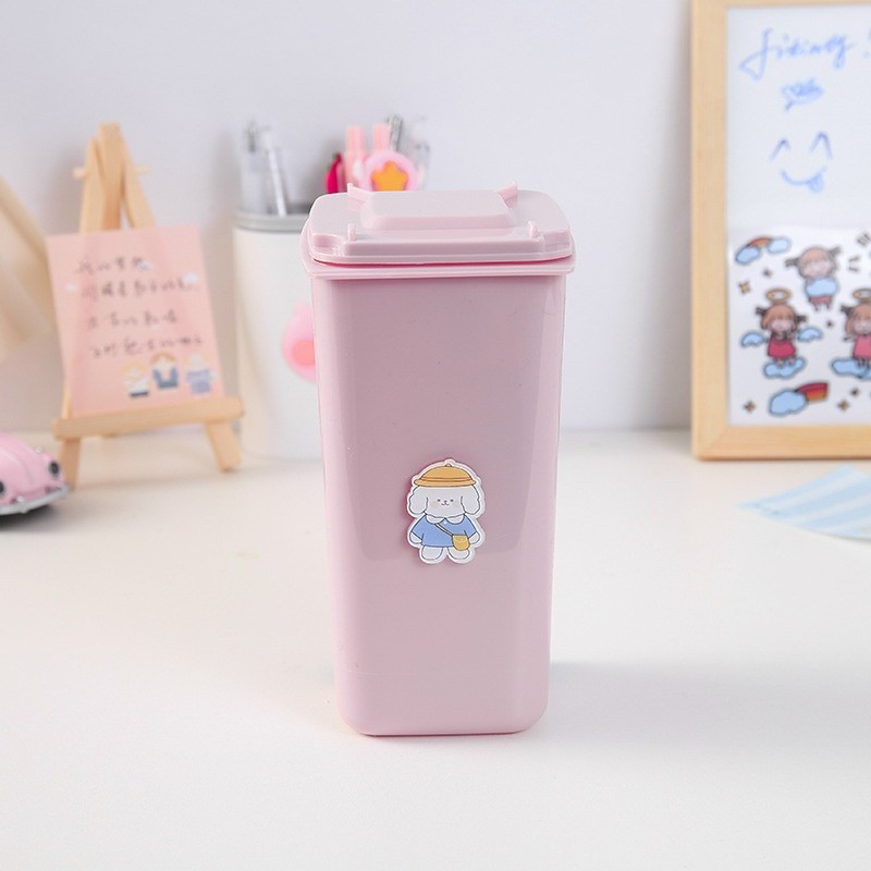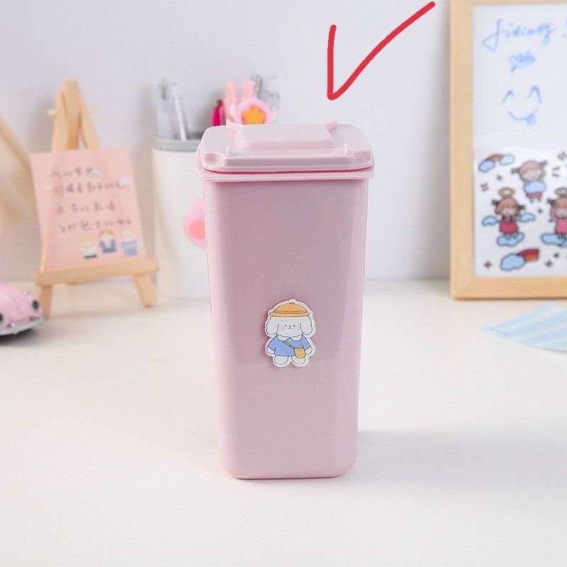 Thùng rác mini để bàn kiêm hộp bút màu hồng có bánh xe và nắp siêu cute dễ thương
