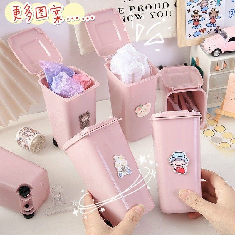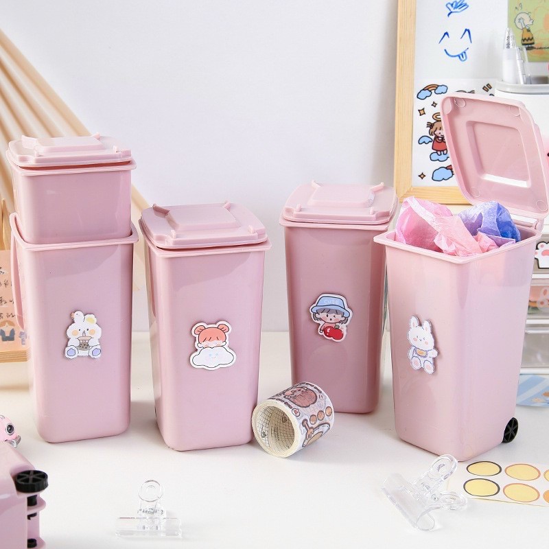 Thùng rác mini để bàn kiêm hộp bút màu hồng có bánh xe và nắp siêu cute dễ thương cao cấpThùng rác mini màu hồng có nắp đậy là một trong những item không thể không kể đến trong góc học tập, làm việc của các bạn nữ, dùng decor đựng bút, đựng rác tiện dụng, hoặc có thể dùng lưu trữ đồ nhỏ gọn như washitape, sticker, dây cột tóc