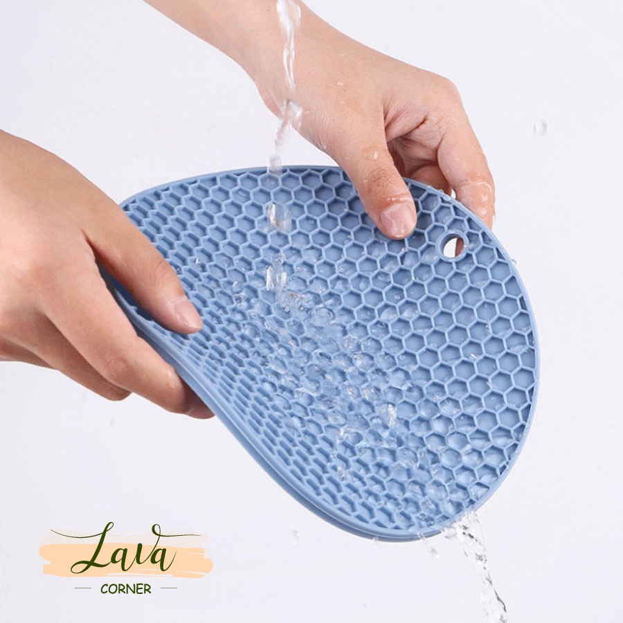 - Chất liệu silicon không thấm nước giúp việc rửa vết bẩn, vết dầu mỡ trên miếng lót nồi thật dễ dàng, đặc biệt miếng lót nồi có lỗ treo giúp cho việc phơi ráo và cất gọn.