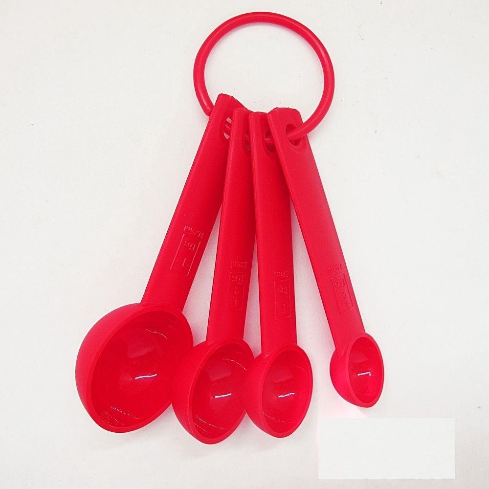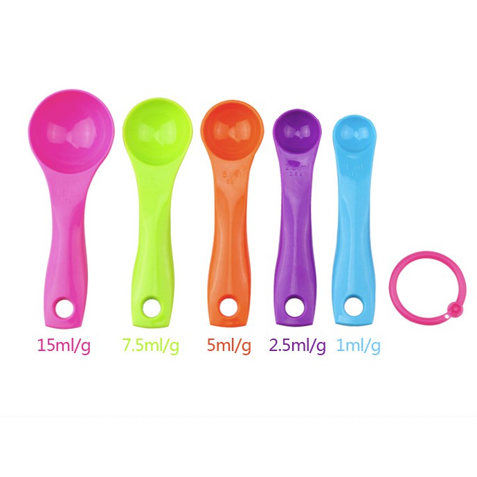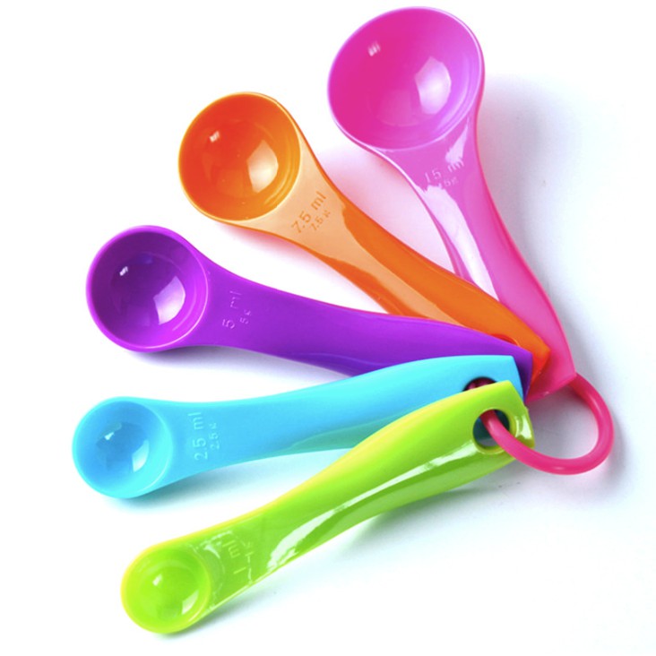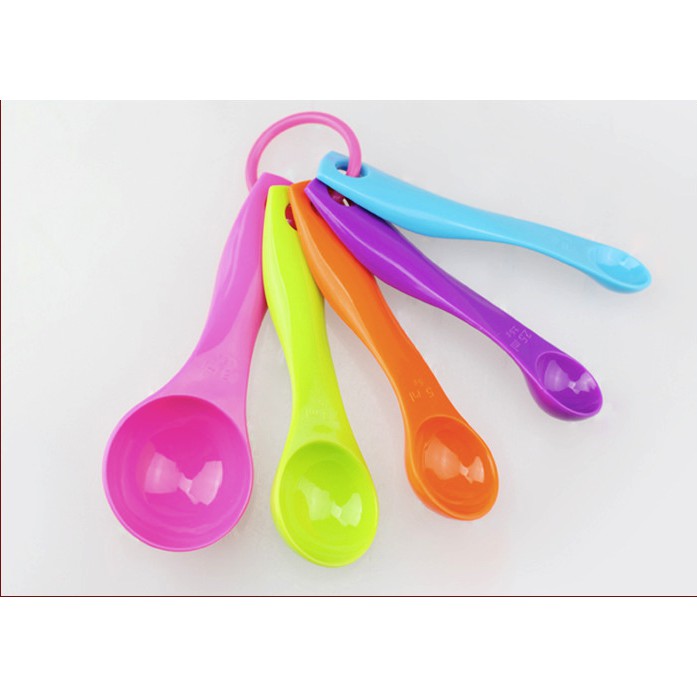 - Bộ thìa đong 5 chiếc được làm từ nhựa với nhiều màu sắc và dễ dàng vệ sinh.