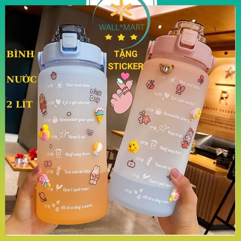 BÌNH ĐỰNG NƯỚC 2 LÍT TẶNG KÈM STICKER GIỮ NHIỆT NHỰA NHẮC UỐNG NƯỚC CÓ ỐNG HÚT CHIA VẠCH BÁO GIỜ CUTE WALLMART WM132