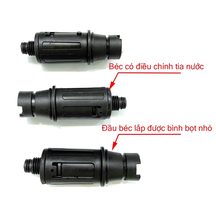 - Đầu béc xịt lắp được bình bọt tuyết nhỏ đi theo máy hoặc bình 0,5L