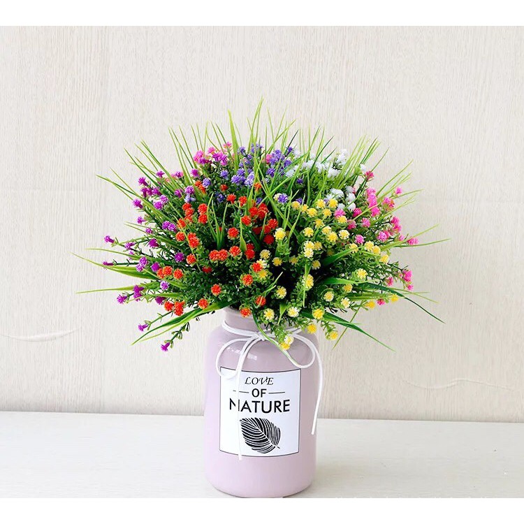 Hiện nay, việc dùng hoa giả để trang trí đã trở thành lựa chọn của rất nhiều người bởi các loại hoa giả thường đa dạng về màu sắc và chủng loại cùng với tính thẩm mỹ cao không khác gì hoa thật. Đặc biệt, hoa giả không mất thời gian chăm sóc, bạn chỉ cần đặt hoa vào vị trí mong muốn. Hoa giả có thể dùng được nhiều năm trong khi chi phí bỏ ra để mua vô cùng rẻ, điều này mang lại lợi ích lớn về kinh tế cho người dùngCành hoa nhí giả màu sắc tươi sáng đẹp mắt sử dụng trang trí nhiều không gian như trồng ở khu vực tiểu cảnh, cắm trang trí trong nhà