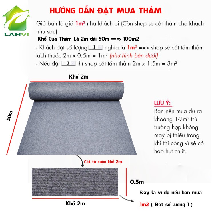 • Khách đặt số lượng 1 lần nghĩa là 1 mét vuông, thì shop sẽ cắt tấm thảm kích thước 2m x 0.5m, nếu đặt 3 lần thì shop cắt tấm thảm 2m x 1,5m = 3m2.