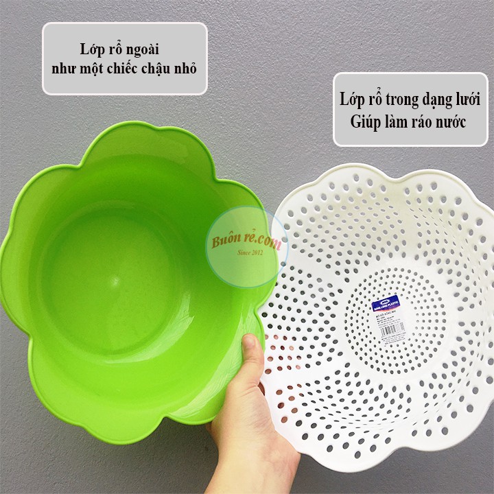 - Rổ nhựa hoa mai Song Long 2in1 được thiết kế thông minh 2 in 1 với lớp trong rổ thiết kế dạng mắt lưới giúp làm ráo nước, lớp bên ngoài thiết kế nhưa một chiếc chậu nhỏ giúp hứng nước từ rổ bên trong.
