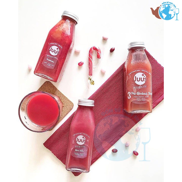Nhà cửa & Đời sống > Bộ đồ bàn ăn > Bình nước & phụ kiện || [Mã LIFE1003ALL giảm 10% đơn 50K] Chai thủy tinh vuông nắp nhôm 330ml đựng nước trái câyCòn hàng
