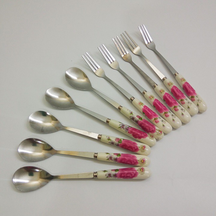 Thìa dĩa ăn hoa quả trái cây bánh kem inox cán sứ hoa hồng
