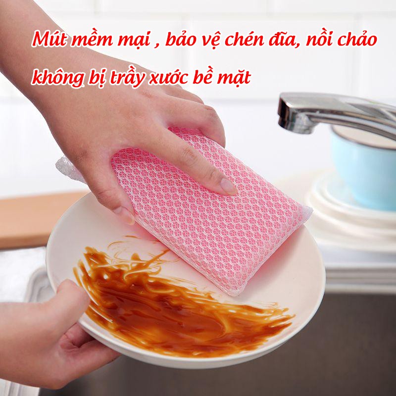 - Đặc tính: mút rửa bát có độ bền cao, sử dụng được trong thời gian dài do miếng xốp đc bọc trong lưới có khả năng chịu ma sát tốt.