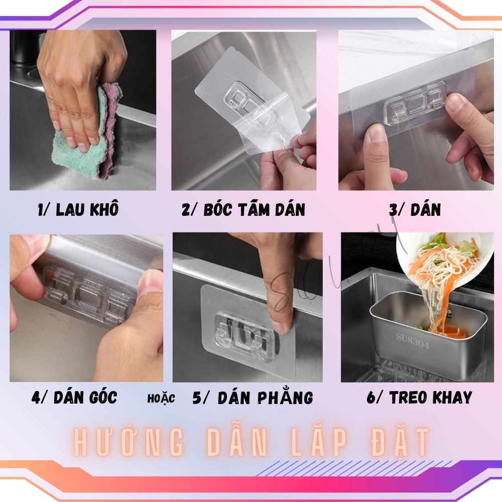 Lau khô bề mặt dán, bóc tấm treo kèm theo sẫn keo dán lên bề mặt khô ráo của chậu rửa chén bát và treo rổ sử dụng