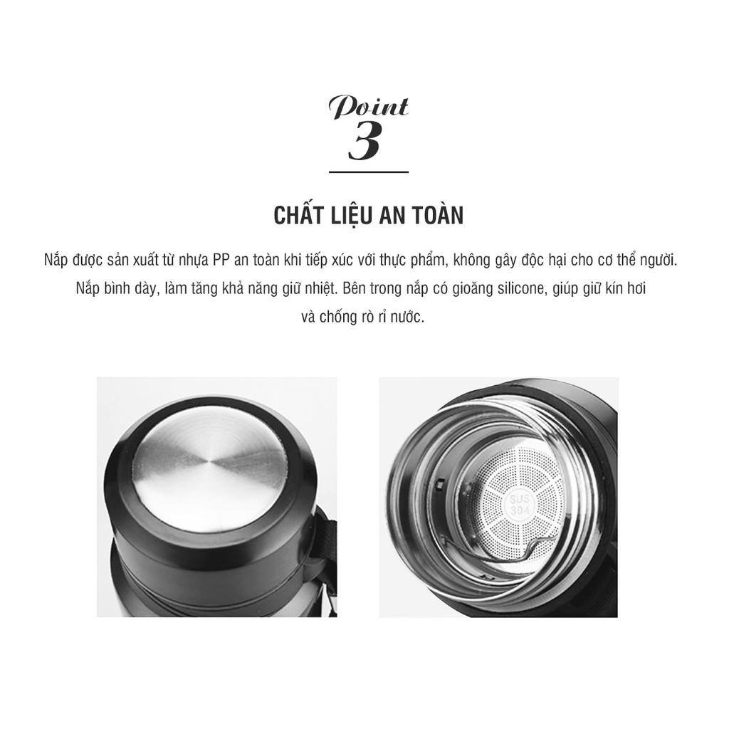 Nắp bình có gioăng vặn kín khít giúp nước không bị tràn ra ngoài khi di chuyển đồng thời tăng khả năng giữ nhiệt bên trong. Phần nắp có gờ giúp bạn dễ dàng khi thao tác vặn mở - đóng, thuận tiện trong quá trình sử dụng.