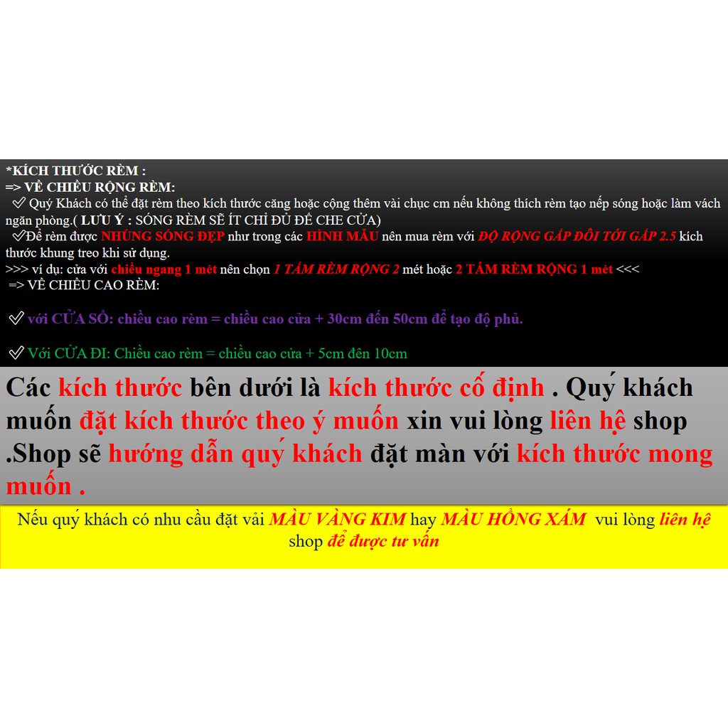 +Cách Chọn Kích Thước Rèm: Shop có mọi kích thước cho rèm cửa chính cũng như rèm cửa sổ. Bạn NÊN NHẮN TIN cung cấp chiều ngang và chiều cao lọt lòng của cửa và nhu cầu sử dụng để Shop Tư Vấn một cách chính xác và phù hợp nhất.