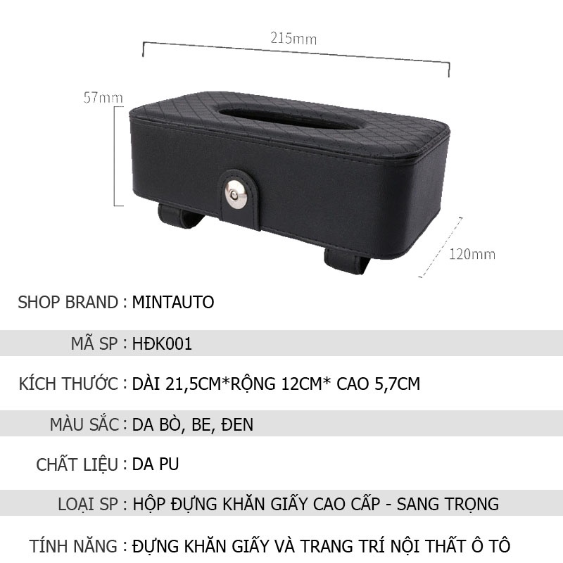 - Hộp đựng khăn giấy bằng da cao cấp là sản phẩm nội thất thiết thực đồng thời làm tăng vẻ sang trọng cho không gian ô tô của bạn, sản phẩm có thiết kế bắt mắt, tạo sự chú ý, dễ nhận biết cho mọi người.