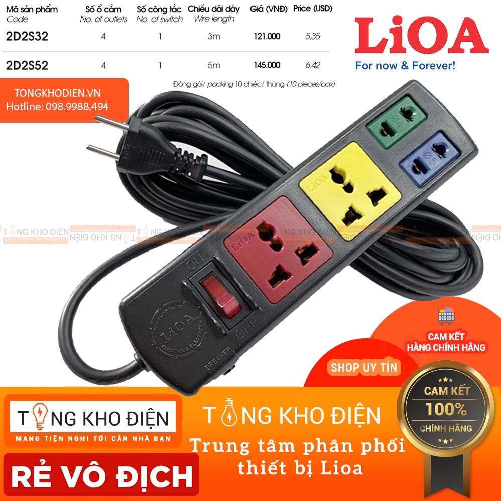 Giới thiệu Ổ cắm điện LIOA, 4 lỗ, có công tắc, ~2200W, dây dài 3m/5m, mã: 2D2S