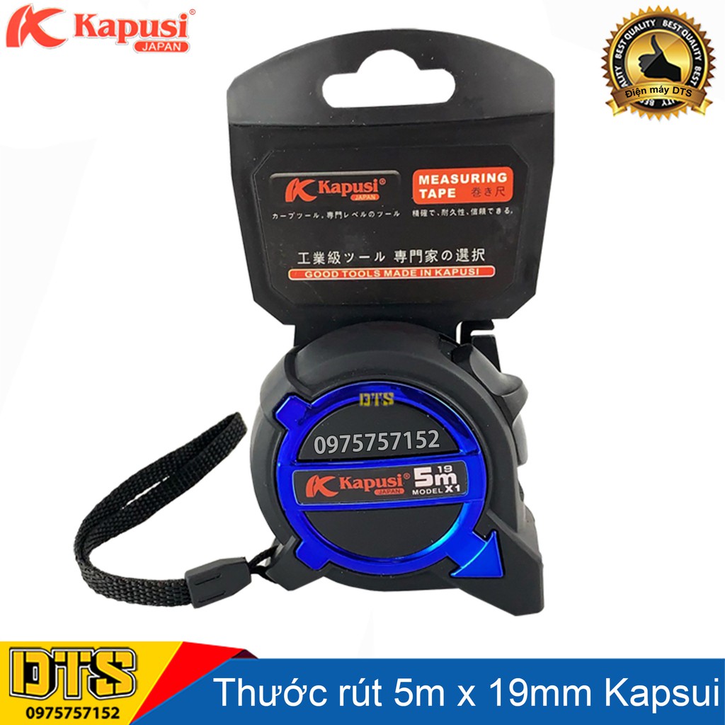 Thước rút - Thước cuộn 5m Kapusi Japan và bề ngang lá thước 19mm với hệ đo là mét. Các chỉ số trên mặt thước rõ ràng, giúp đọc chính xác.