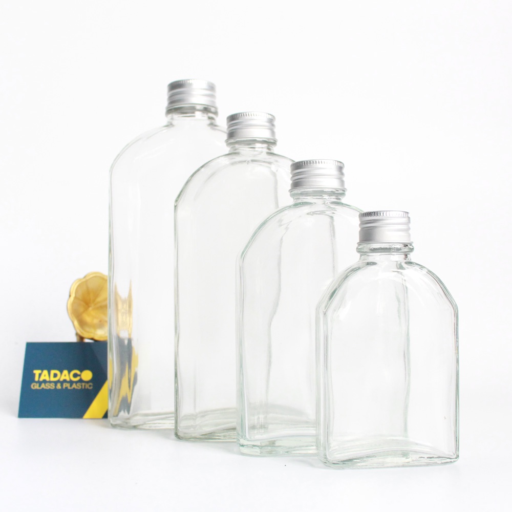 - Chai thủy tinh nắp thiếc Dẹp vai vuông Với hình dáng thiết kế độc đáo đi kèm nắp nhôm đảm bảo độ kín của sản phẩm, sản phẩm chai thủy tinh dẹp nắp nhôm sẽ là lựa chọn của bạn khi tìm kiếm chai thủy tinh đựng cafe, nước ép