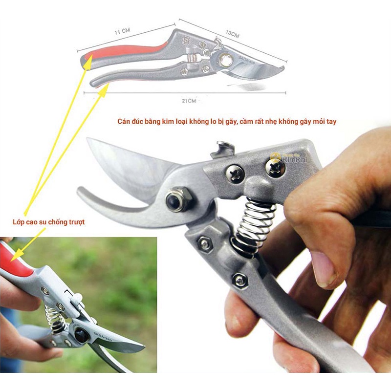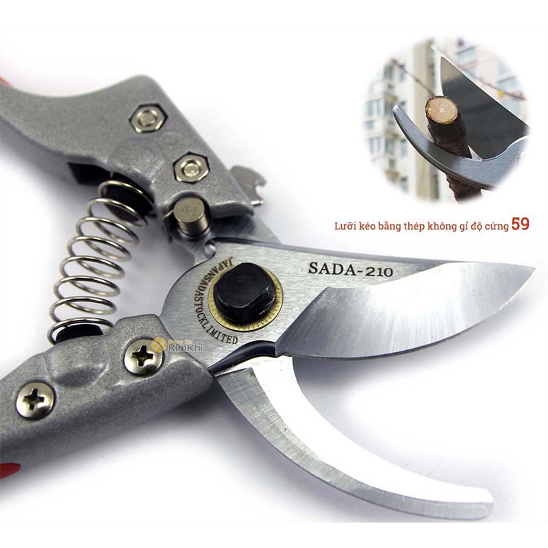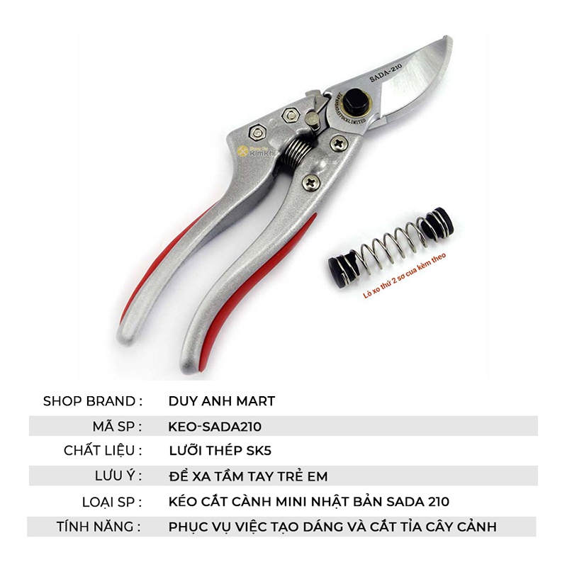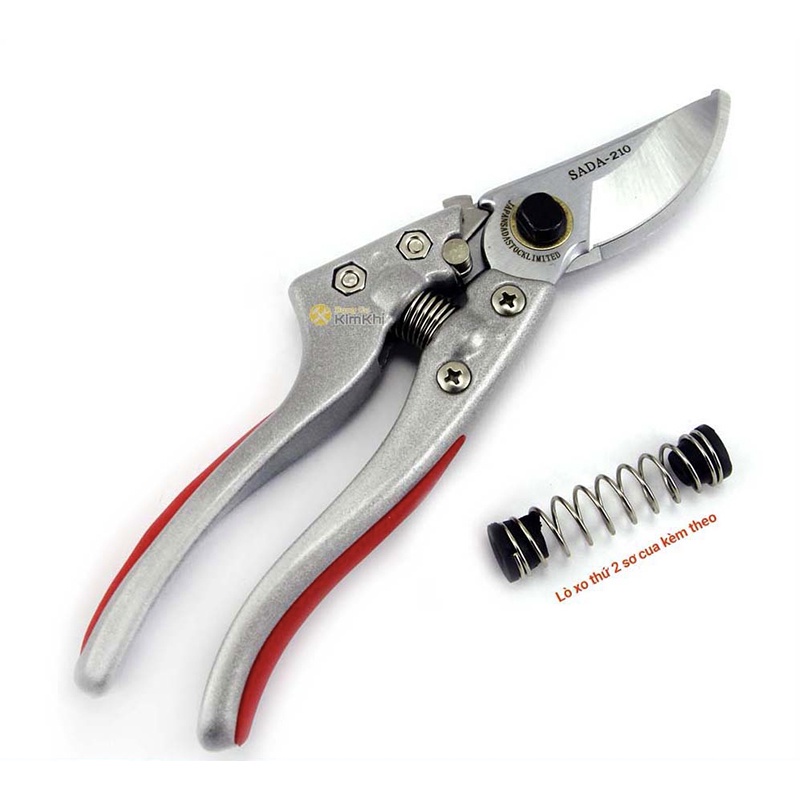 Kéo cắt cành mini nhật bản SADA 210 tỉa cành cây trên cao Duy AnhKÉO CẮT CÀNH CÂY SADA chính hãng Nhật Bản SK5 SADA 210 còn mệnh danh là KÉO SẮC VĨNH VIỄN được sản xuất với lưỡi kéo sắc bén có độ cứng cao, độ bền đạt một triệu lần cắt được các thợ làm vườn, cắt tỉa cây cảnh, bonsai tin dùng. Lưỡi kéo bền đến nỗi sản phẩm còn thêm cả một lò xo dự phòng theo chất lượng "lò xo hỏng mà lưỡi chưa cùn".
