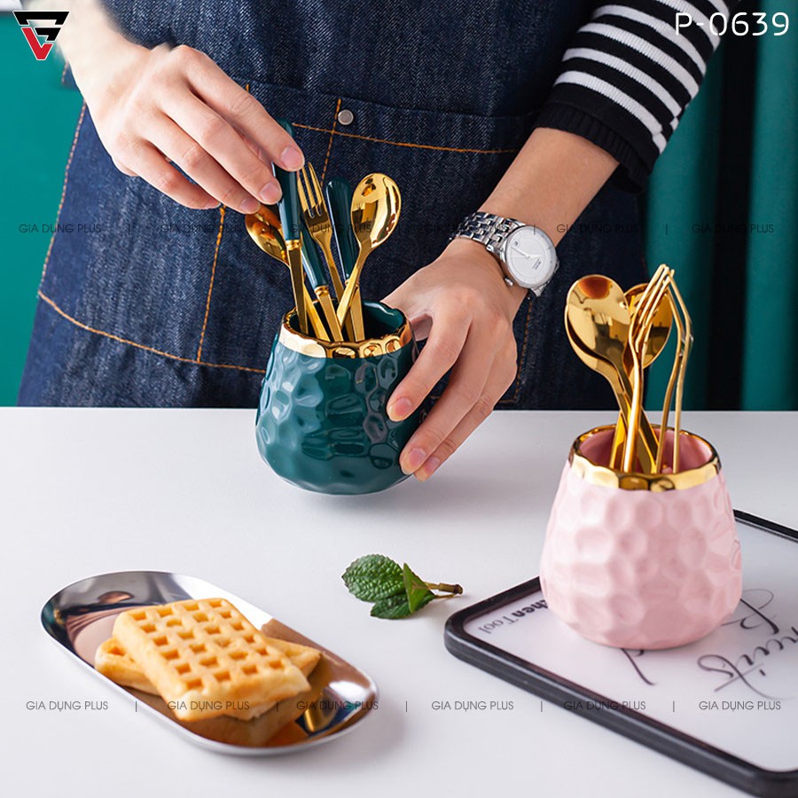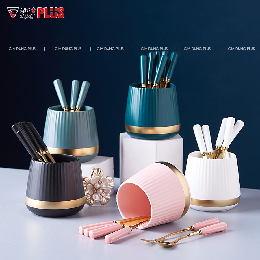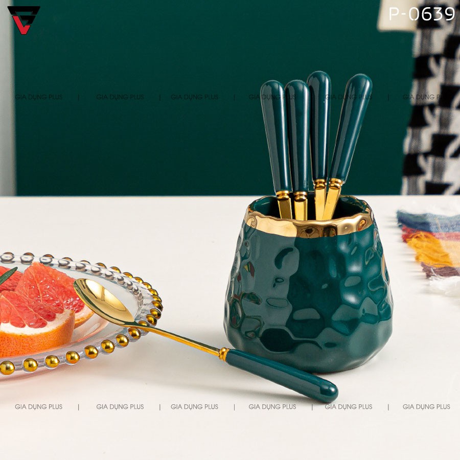 Lọ sứ đựng nĩa trái cây, muỗng cafe (có muỗng+nĩa kèm theo) cao cấp - GiaDụngPlus
