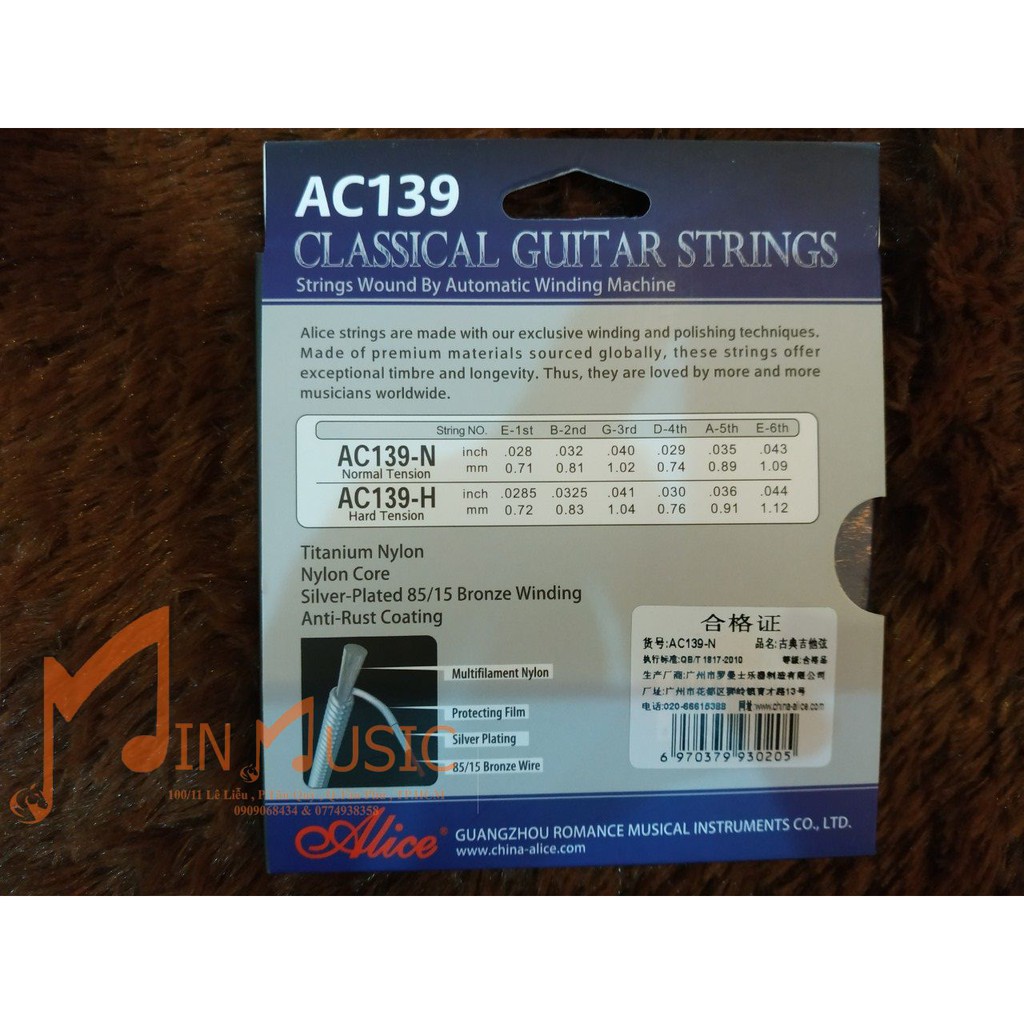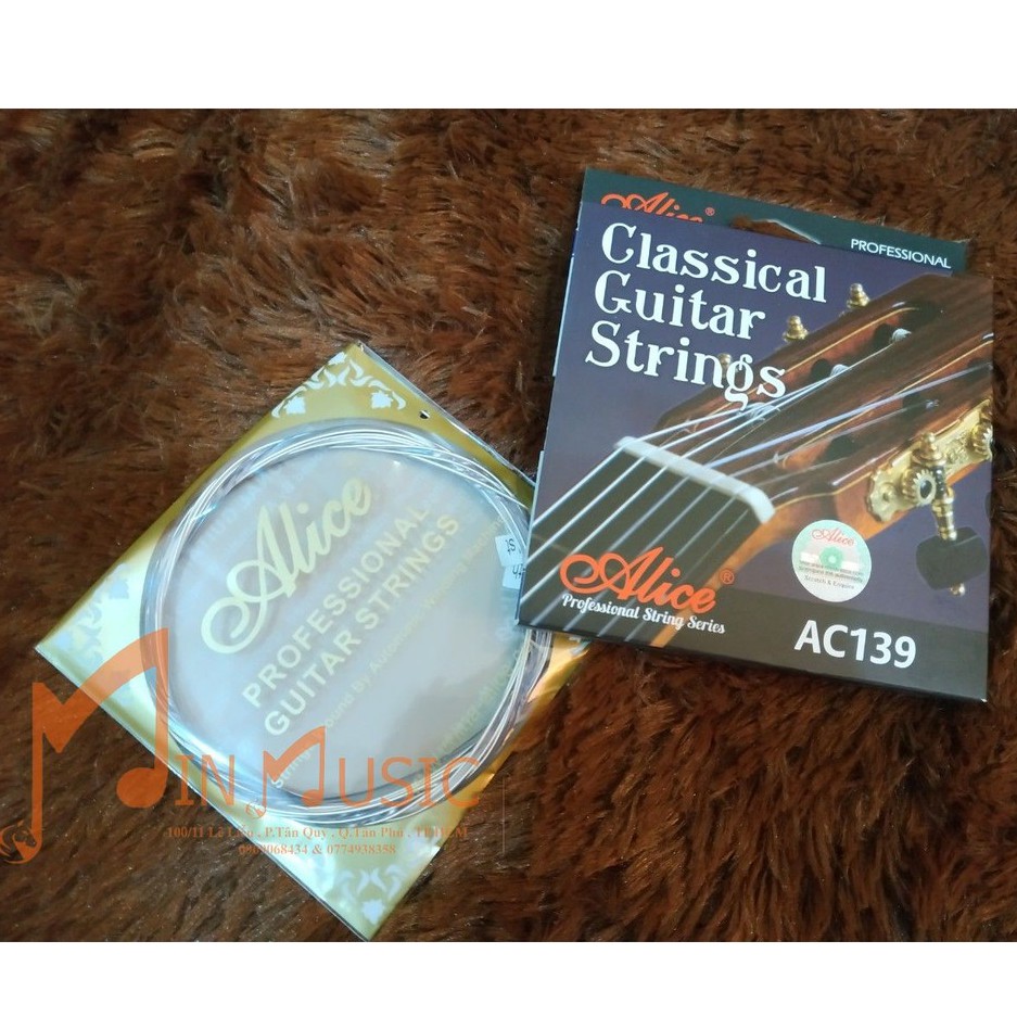 Dây đàn guitar classic Alice AC139 được làm ra bởi công nghệ hiện đại của hãng AliceDây treb được làm ra bởi các sợi titanium - nylon chất lượng cao, còn dây bass được làm bởi các sợi đồng và bạc tỷ lệ 85/15 tạo ra âm thanh trầm ấm, trong cho tiếng đàn.