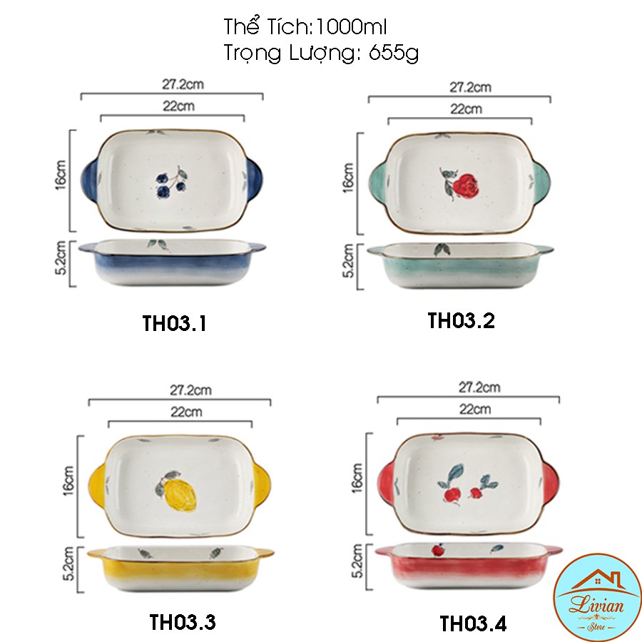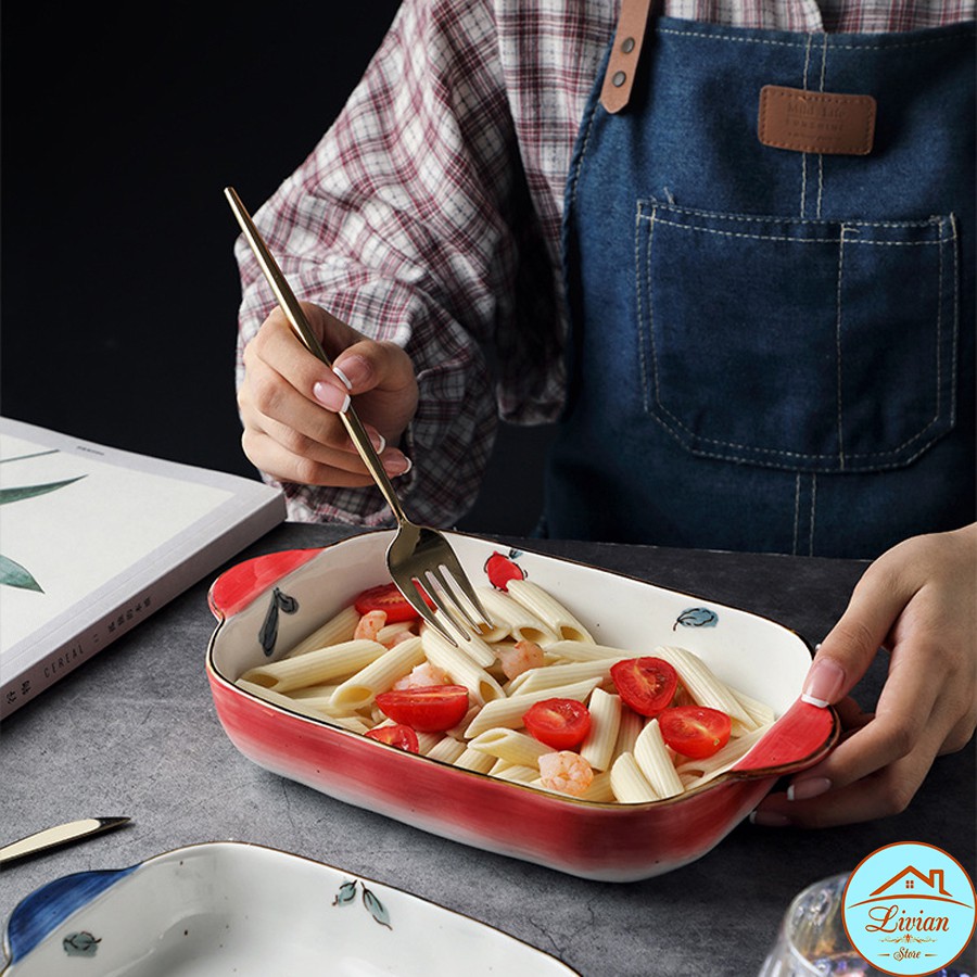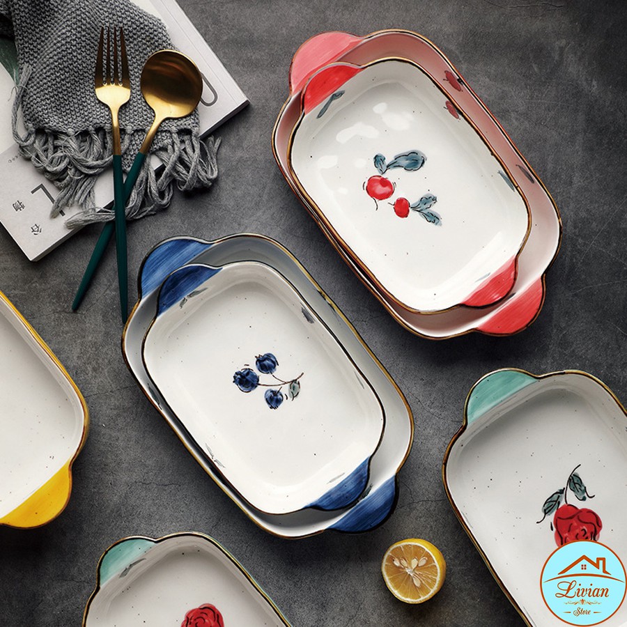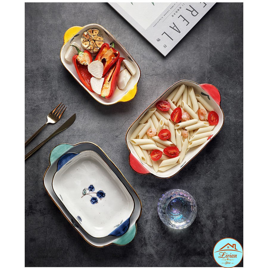 Nhà cửa & Đời sống > Dụng cụ nhà bếp > Dụng cụ nướng & trang trí bánh || [Mã LIFE20KALL giảm 10% đơn 50K] Bát sứ, thố nướng chữ nhật có quai cầm họa tiết hoa lá quả kích thước 18cm, 22cmCòn hàng