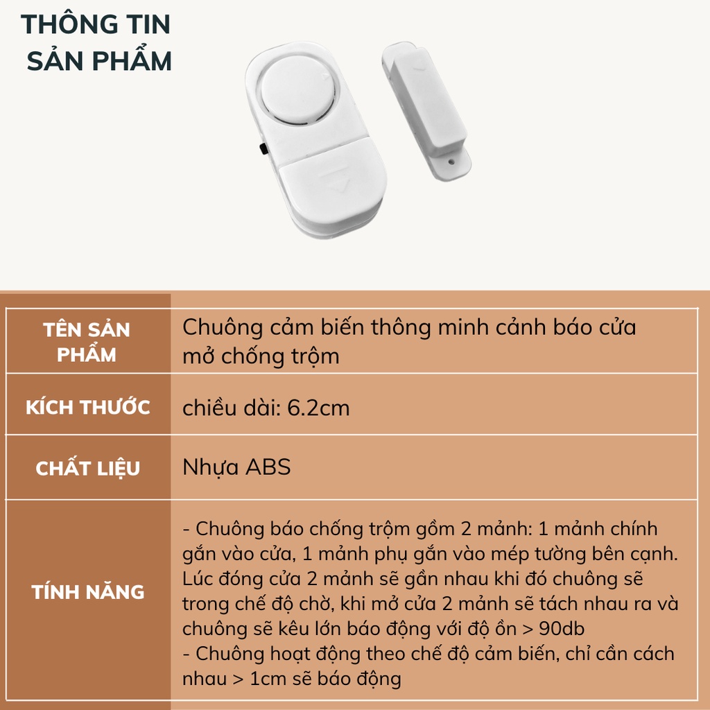 - Chuông báo chống trộm gồm 2 mảnh. Khi để gần 2 mảnh thì chuông sẽ yên lặng, khi tách xa ~1cm chuông sẽ hú báo động.