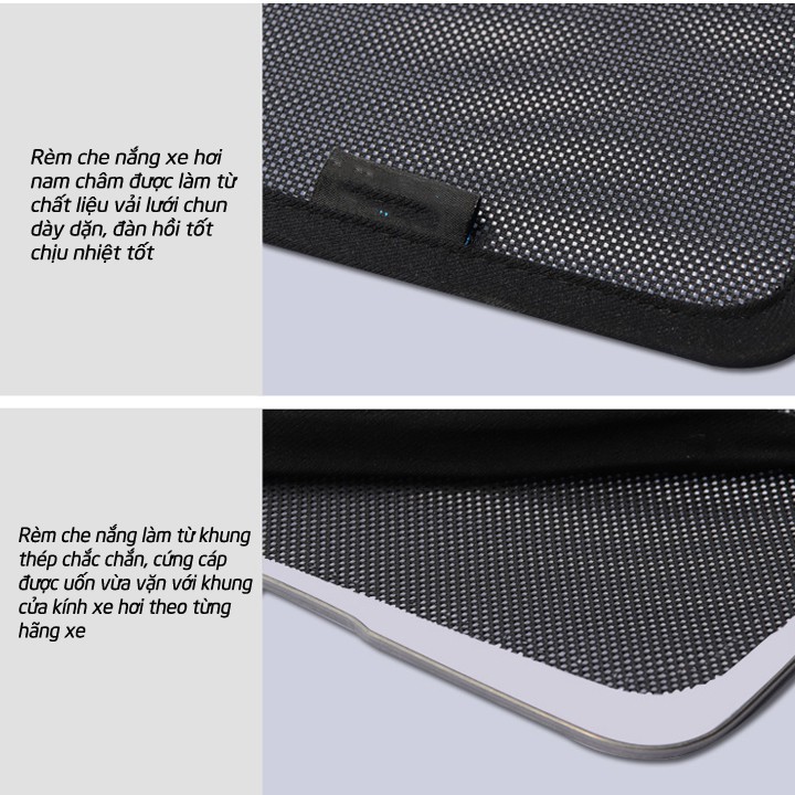 Bộ rèm che nắng cho xe hơi có nam châm giúp cố định miếng che nắng vào phía bên trong mặt cửa kính, thật tiện lợi khi bạn hạ kính xe mà không phải tháo rỡ miếng che nắng